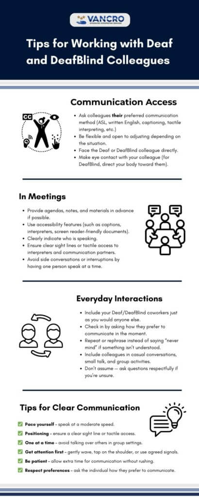 Vancro is deeply committed to allyship with the Deaf and DeafBlind communities we serve nationwide through education, outreach, events and sponsorship.